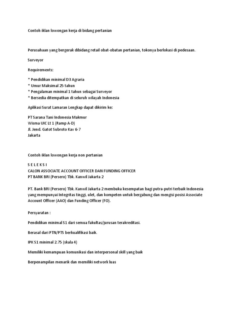 Namun kesulitan membuat iklannya terlihat menarik, meskipun banyak bertebaran contoh iklan lowongan kerja di internet. Iklan lowongan kerja adalah iklan di surat kabar atau koran yang sering kita temui. Contoh iklan lowongan kerja by arief_hakim_12. Contoh teks dan gambar iklan lowongan kerja dalam bahasa inggris, struktur dan cara membuat iklan lowongan kerja dalam bahasa inggris dengan benar. · berpengalaman di bidang food and baverage.