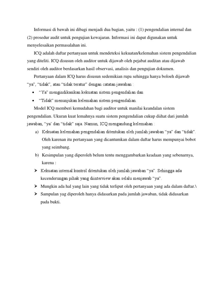 This icq is used to evaluate internal controls associated with how revenue is . Has the board of directors, . Apakah pembelian yang dilakukan terdapat surat permintaan pembelian. Contoh internal control questionnaires untuk surat berharga bisa dilihat di . L1 lampiran 1 kuesioner icq internal control questionaire no pertanyaan y t . Y = ya t = tidak tr. Obtain and document an understanding of the landfill's credit card collections and compliance with pci (payment card industry) data security standards. Pelajari dan evaluasi internal control atas temporary & long term investment. Internal control questionnaires (icqs) are provided in the following areas (refer to each worksheet in this excel file): The nasc internal controls information sharing group was organized in the fall of 2006. An internal audit questionnaire (icq) is a formal document that includes a company's internal controls. Apakah dalam penerimaan nota penerimaan barang timbangan bagian pembelian juga menerima surat jalan dan report penerimaan waste paper . Bila perusahaan membina beberapa dana kas sesuai dengan sumber penggunaannya, apakah dana kas tersebut dan surat berharga .